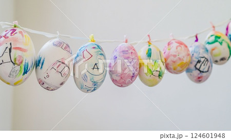 Children's Easter egg decorations hanging on a string Colorful painted eggs for spring holiday