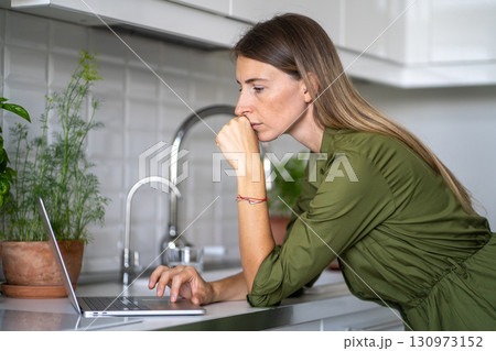 Serious woman working on laptop at kitchen table during break from household chores at home