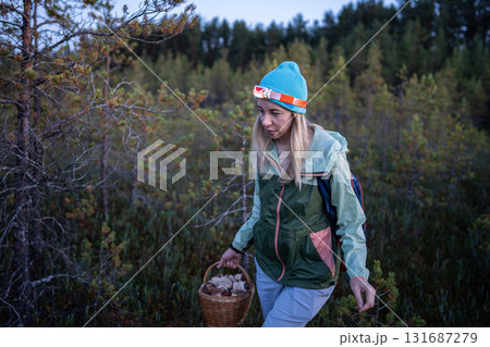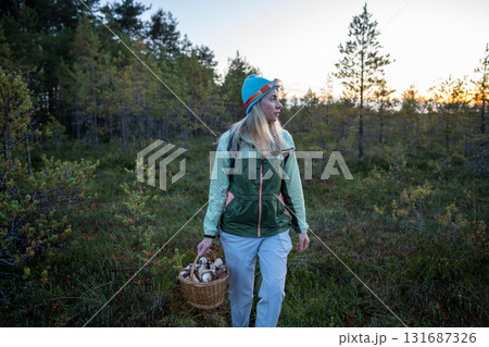 Woman walks in autumn swamp forest with basket mushrooms at dusk, lighting way with headlamp on head