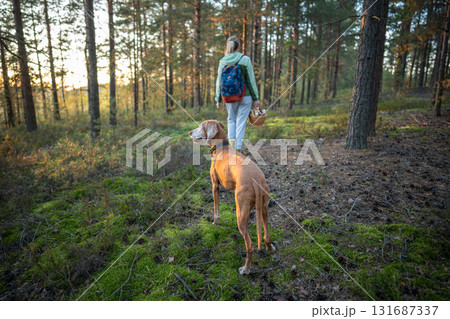 Woman with vizsla dog in autumn pine forest with basket full of porcini mushrooms, back view