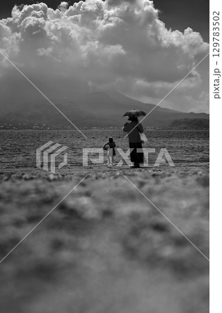 父母與孩子在櫻花盛開的粉紅蝶花田裡漫步
