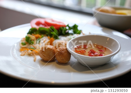 Top down shot of vietnamese food on the wooden table in vietnamese restaurant in Perth