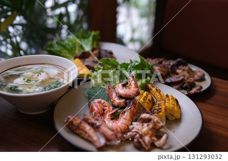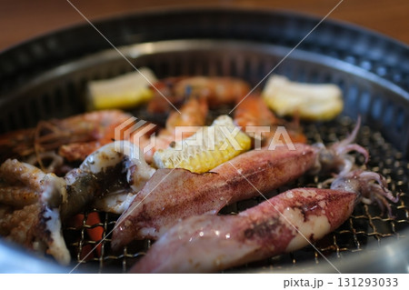Grilled seafood corn Mixed corn and seafood barbecue. Grilled corn and chicken on the barbecue. Grilled prawns sizzle on the barbecue when the prawn is flipped.