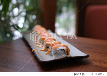 Sushi rolls platter Slow motion close-up of plated sushi rolls as white sauce is drizzled over top