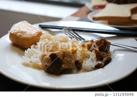 Rice meat bread Thailand. We were having Thai food Fried chicken with red curry at a Thai restaurant.