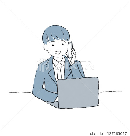 一名員工一邊打電話一邊使用電腦的插圖