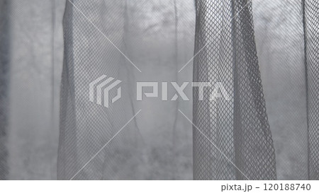 Delicate Mesh Curtains Billow Gently in a Serene, Misty Outdoor Setting