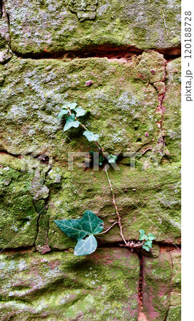 Green Ivy Climbing on an Old Stone Wall Covered in Moss and Texture