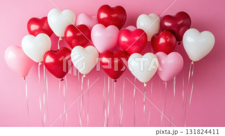 Heart-shaped balloons create a festive atmosphere for celebrations or events on a pink backdrop