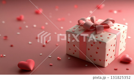 Delicate gift box adorned with hearts rests on a soft pink surface surrounded by tiny love symbols