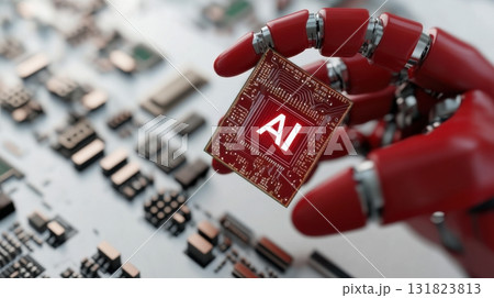 Red robotic hand holds a glowing AI chip over a circuit board with intricate patterns and glowing lines