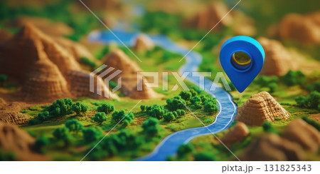 Miniature market stand with location pins displayed in a creative art style during daylight