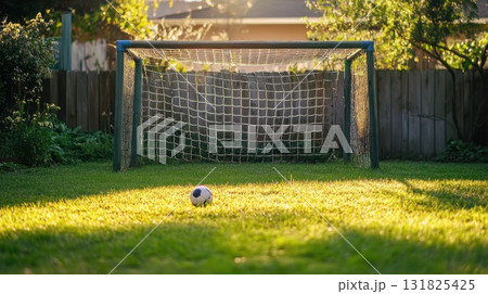 Soccer goal and ball resting in a lush backyard during golden hour
