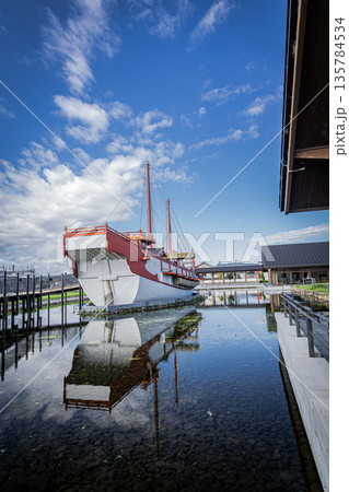 奈良平城京遺址的仿古船與藍天