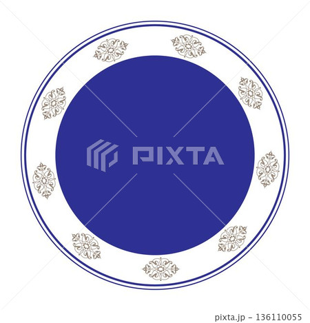 Round frame Greek porcelain plate with blue pattern. Plate with floral elements. Egyptian pattern. Ancient Greece, Roman Empire. Pattern for circle ceramics, textiles, plate, embroidery, laser cutting