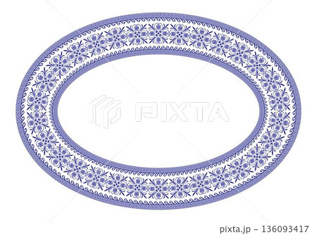 Beautiful oval frame arabesques. Golden blue plate with Greek key, wave, stylized floral pattern. Vintage, ethnic vector frame EPS. Pattern frame for ellipse surfaces, textiles, embroidery, porcelain