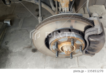 A close-up of a vehicle wheel hub assembly, showing a brake rotor, rusted lug studs, the brake caliper, and the center axle nut, likely undergoing maintenance