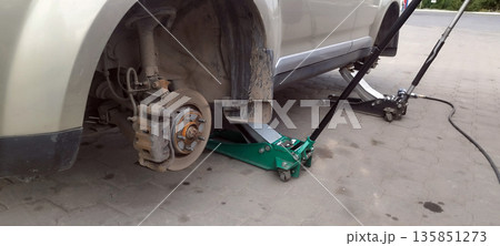The beige car is lifted with a green jack, revealing a dusty rear disc brake, suggesting the wheel has been removed for repair or outdoor maintenance.