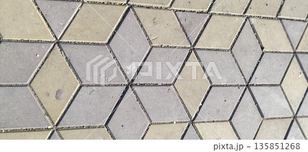 Close up, overhead view of interlocking paving stones forming a 3D cube illusion pattern with alternating gray and beige diamond rhombus shapes.