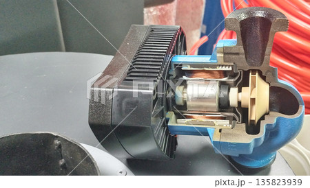 Cutaway view of a circulator pump shows the internal workings: the black motor housing, copper windings, rotor, and the blue cast iron volute with a plastic impeller