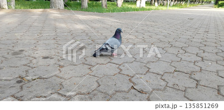 Pigeon with iridescent neck feathers stands on a gray, zigzag-patterned paved path in a park, with green grass and trees in the sunlit background.