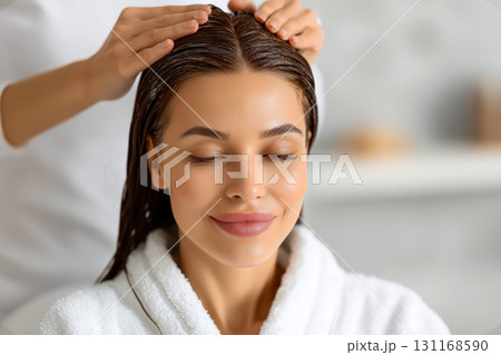 Calm woman receiving scalp massage gently, massage therapist works with caring hands, massage oil nourishes hair, eyes closed in robe, spa ambiance, daylight, wellness mood, cozy self care theme