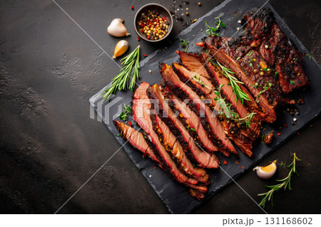 Sliced brisket with pepper crust shines on slate; juicy brisket lined with spice rub and chili flakes, rosemary sprigs and garlic add aroma, brisket ready for bbq menu, rustic serving for grill lovers