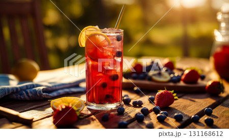 Refreshing berry lemonade with lemon slices, strawberries and blueberries served in tall glass with ice, berry lemonade glowing under sunset light on outdoor wooden table, summer fruity drink