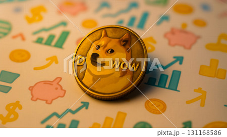 Dogecoin coin featuring dog image placed on background with colorful financial graphs and icons; dogecoin coin shines with meme cryptocurrency character and vibrant economic chart concept