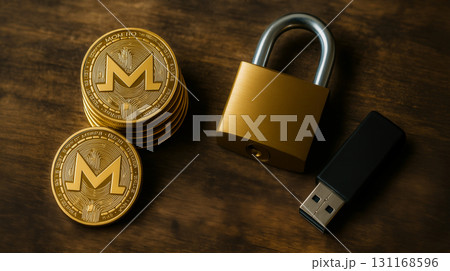 Stack of Monero cryptocurrency coins next to closed padlock and black USB flash drive on wooden surface; Monero coins symbolize privacy as Monero connects with secure private transactions theme