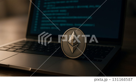 Ethereum coin placed on laptop keyboard near glowing code screen; Ethereum coin represents blockchain technology as Ethereum highlights cryptocurrency development and decentralized app coding theme