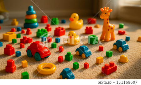 Colorful plastic toys on tiled floor include toy truck, shovel, ring stack and cars; toys such as car and truck dominate this cheerful and sunny indoor playtime setting