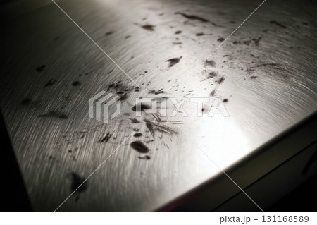 Grease stains on stainless surface; grease smudges spread across brushed steel while grease marks mingle with scratches and tiny droplets, highlighting kitchen cleanup, hygiene focus, maintenance mood