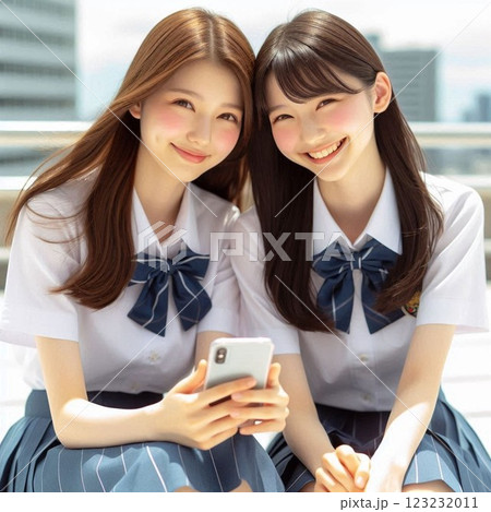 兩名女學生並排坐在學校屋頂上