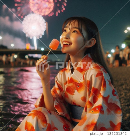 一名女子在河岸邊一邊舔著糖果一邊看煙火