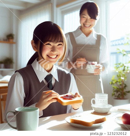 一個身穿校服的女孩和她的母親正在吃早餐