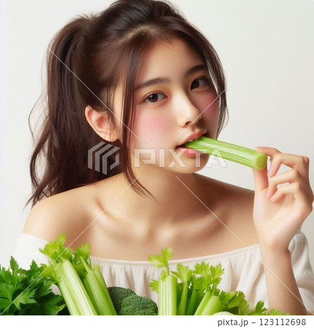 一名綁著馬尾的女子正在咬芹菜