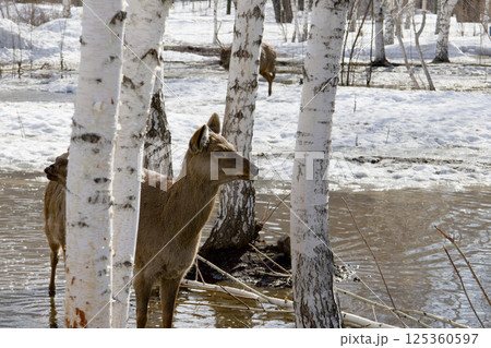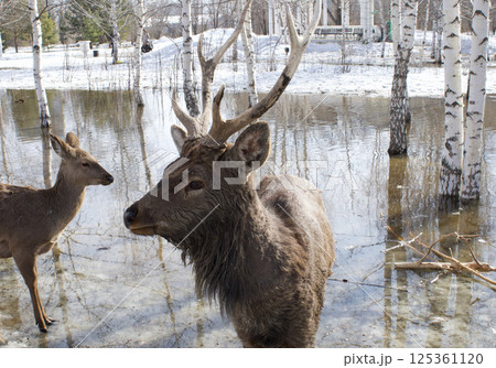 wild deers searches for food in the Ust-Kamenogorsk City Park in Eastern Kazakhstan during daytime snowmelt.