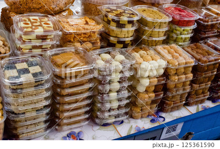 a counter with desserts - honey, cottage cheese and Kazakh delicacies made on the basis of wheat
