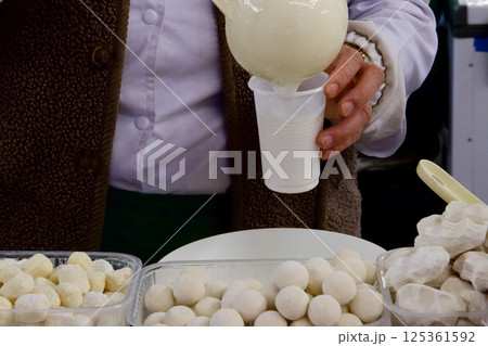 a woman behind a counter with national Kazakh dishes pours a glass of shubat kefir made from camel milk