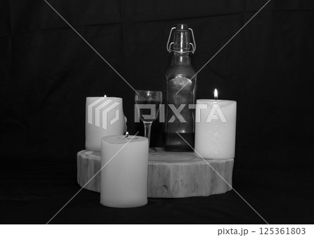 three burning candles on the oak stand with a glass and a bottle of homemade strong drink