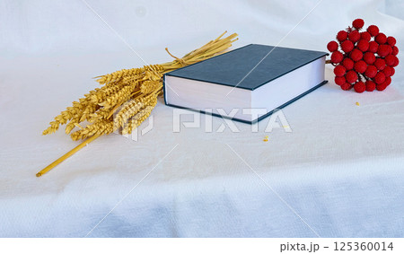 an image of wheat ears with a black book and rad flower on a white background during the daytime