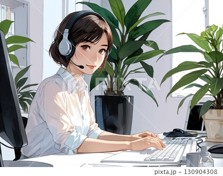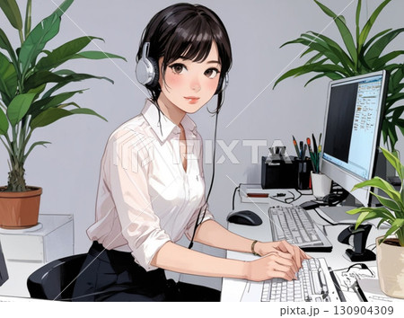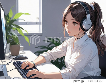 日本女性辦公室職員在電腦上工作(戴著耳機)