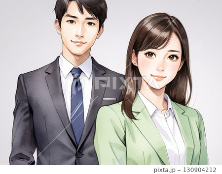 水彩風格插畫|辦公室工作的男女員工(西裝、制服、親切的微笑)