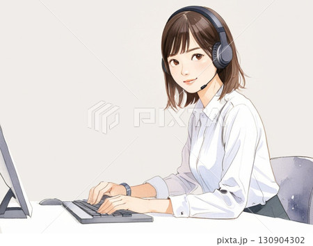 水彩風格插圖|在呼叫中心工作的女接線生(看著攝影機、耳機)