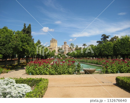 科爾多瓦阿爾卡薩花園裡的花卉和池塘