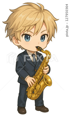 穿著燕尾服的男孩演奏薩克斯風
