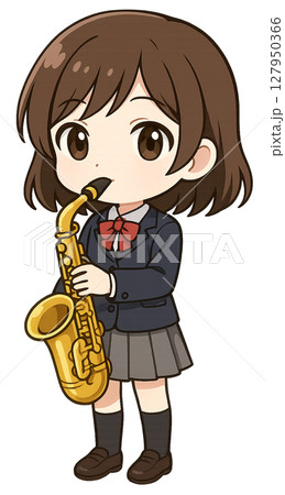一個穿著制服的女孩吹著薩克斯風
