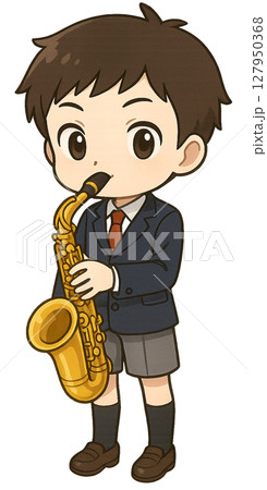 一個穿制服的男孩吹薩克斯風
