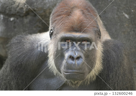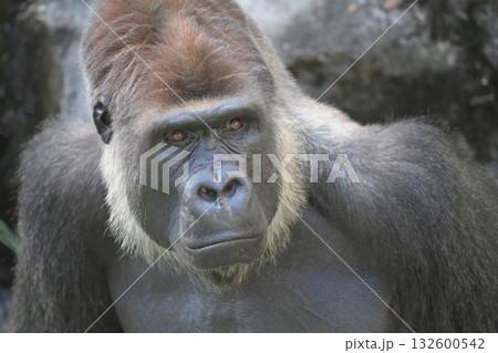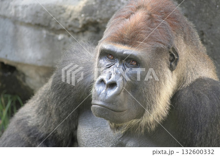 一張面容莊重、皺著眉頭的大猩猩肖像